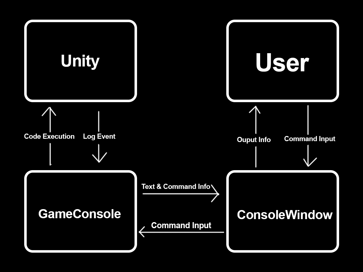 This is the structure and flow of the console logic. Starting from the User, the user will input a raw text command. After the command is entered by the user, it will be sent by the ConsoleWindow to GameConsole to be interpreted into a command for processing. If the console can resolve a raw command into a command, the command is then executed. Working in reverse for log messages, Unity will output a log event. Then GameConsole will interpret the log event into our custom LogMessage type, then store it in the current session log and invoke its own log event. The ConsoleWindow being subscribed to this log event will then add the message contents to its local cache and display it to the User with text.